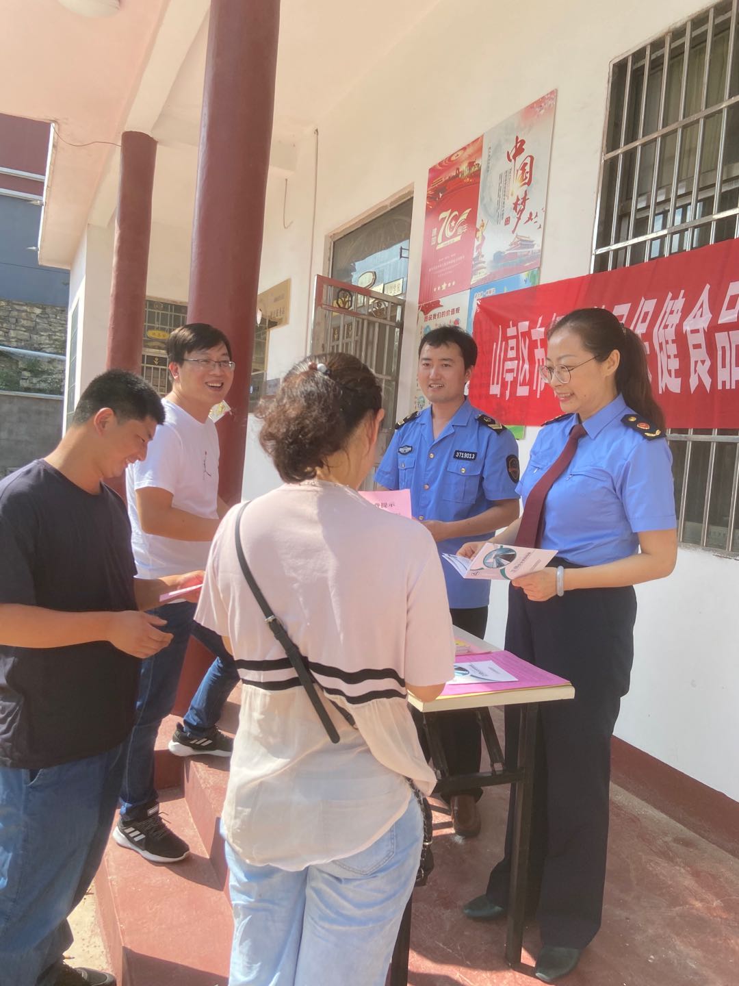 圖為執(zhí)法人員向社區(qū)居民發(fā)放并講解科普知識。