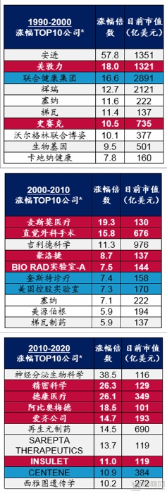 再如2000-2010年,麥斯英醫(yī)療、直覺外科手術(shù)、吉利德醫(yī)學(xué)漲幅均超10倍。2010-2020年,神經(jīng)分泌生物科學(xué)漲幅38.5倍、精密科學(xué)漲幅26.3倍、德康醫(yī)療漲幅26.1倍。