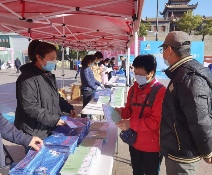 圖為啟動儀式現(xiàn)場工作人員為群眾送上宣傳資料。
