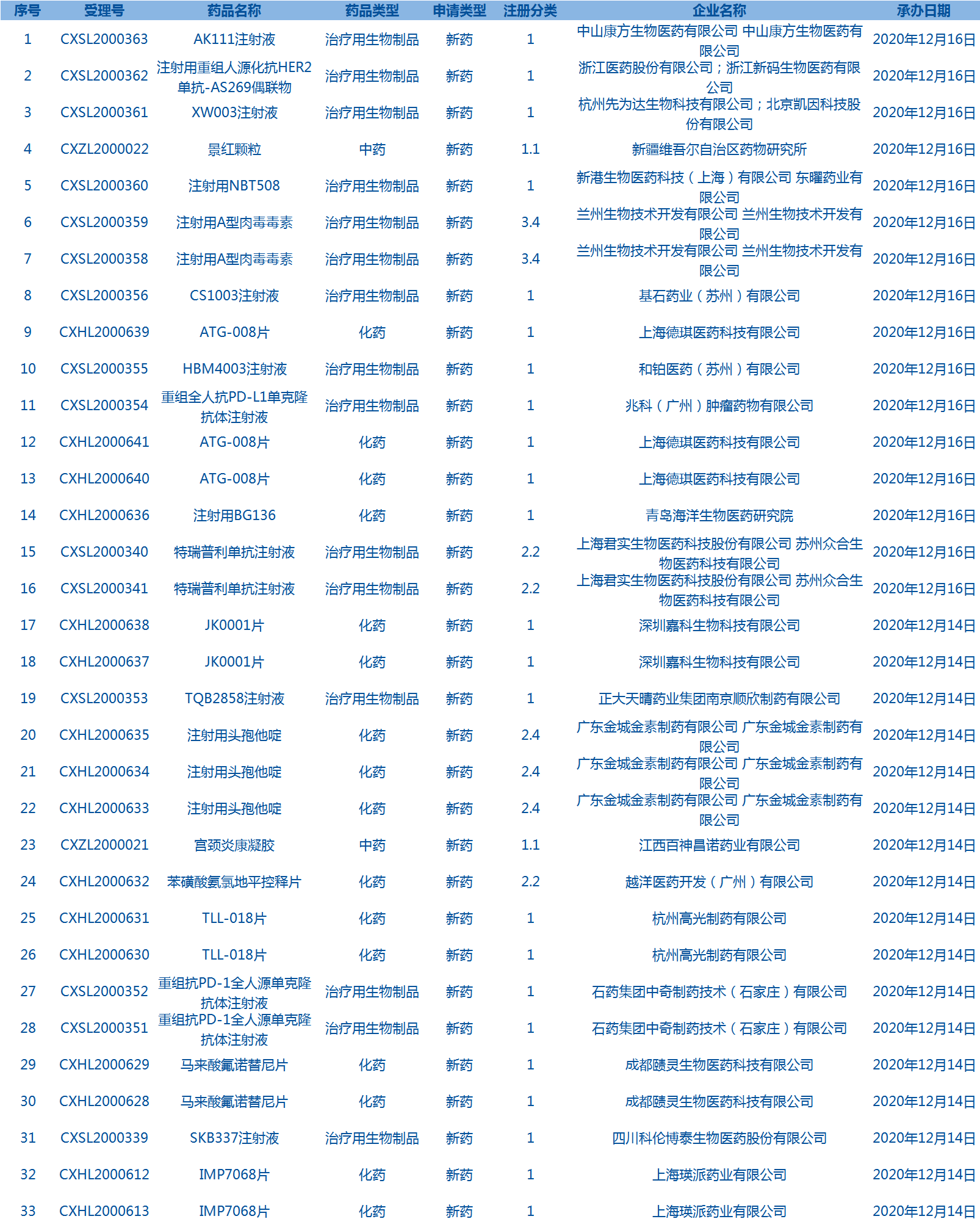 6.CDE承辦受理33個新藥上市申請,包括景紅顆粒等藥品。(截至12月18日)