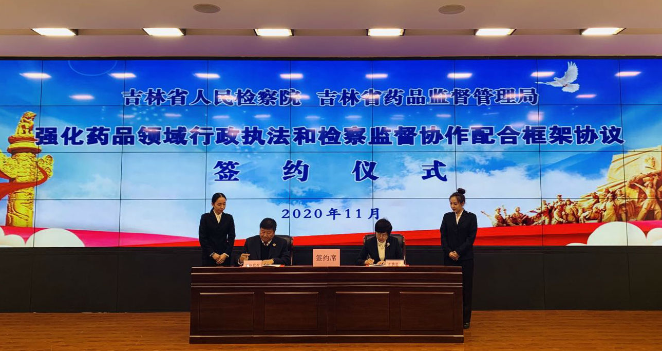 圖為吉林省檢察院和省藥監(jiān)局簽署《關(guān)于強(qiáng)化藥品領(lǐng)域行政執(zhí)法和檢察監(jiān)督協(xié)作配合的框架協(xié)議》。