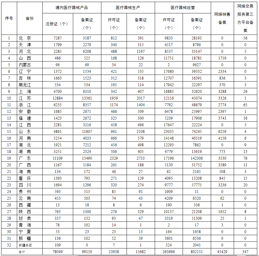 4.國家藥監(jiān)局匯總發(fā)布各省醫(yī)療器械許可備案相關(guān)信息(截至2020年12月31日),具體如下。