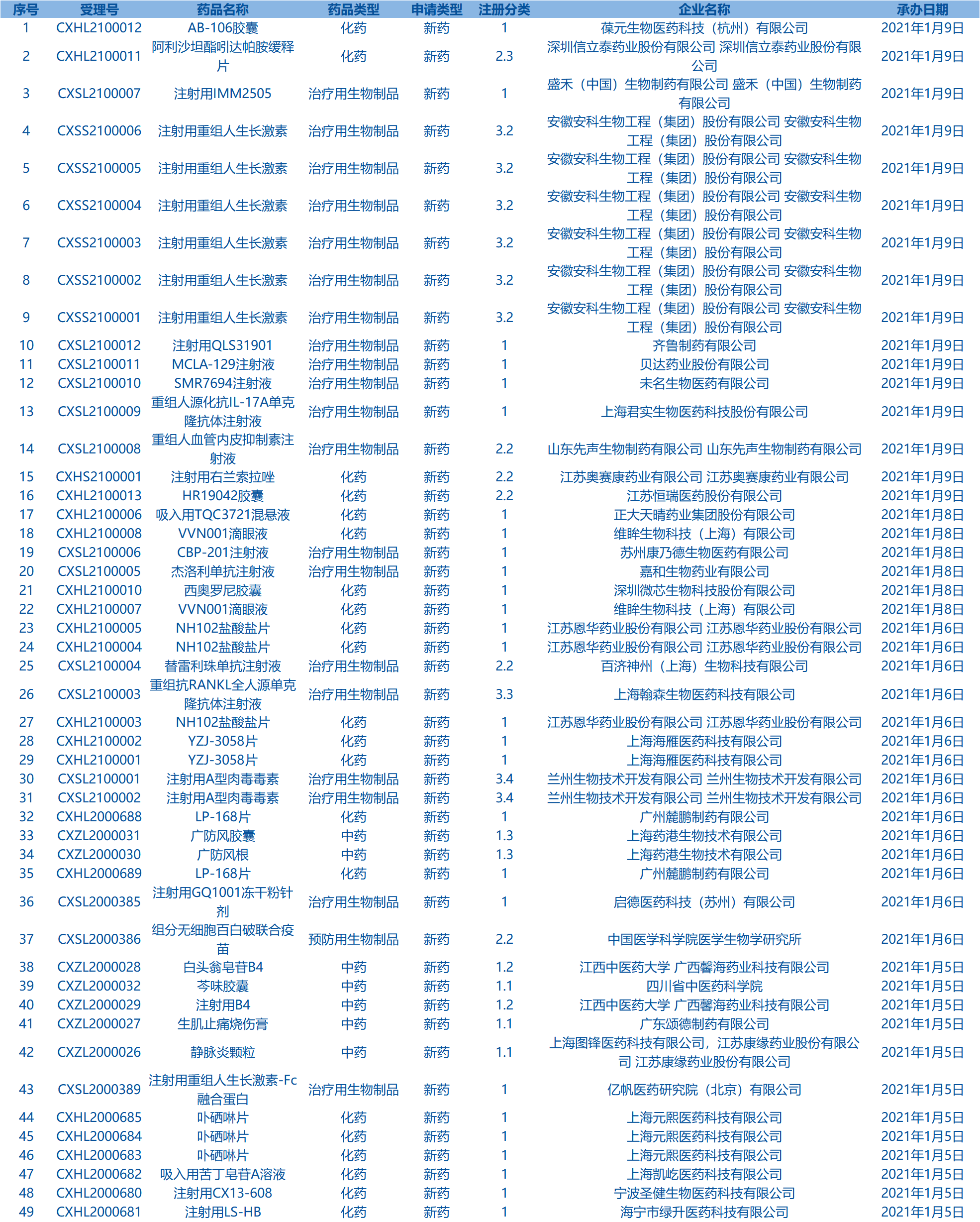 6.CDE承辦受理49個新藥上市申請,包括靜脈炎顆粒等藥品。(截至1月10日)