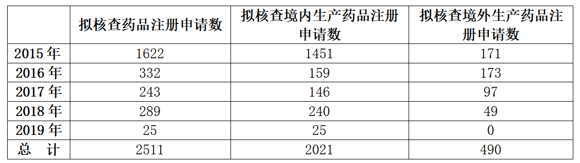 表3.2015~2019年國(guó)家藥監(jiān)部門公布收到的已完成臨床試驗(yàn)申報(bào)生產(chǎn)或進(jìn)口藥品注冊(cè)申請(qǐng)擬進(jìn)行藥物臨床試驗(yàn)數(shù)據(jù)核查情況
