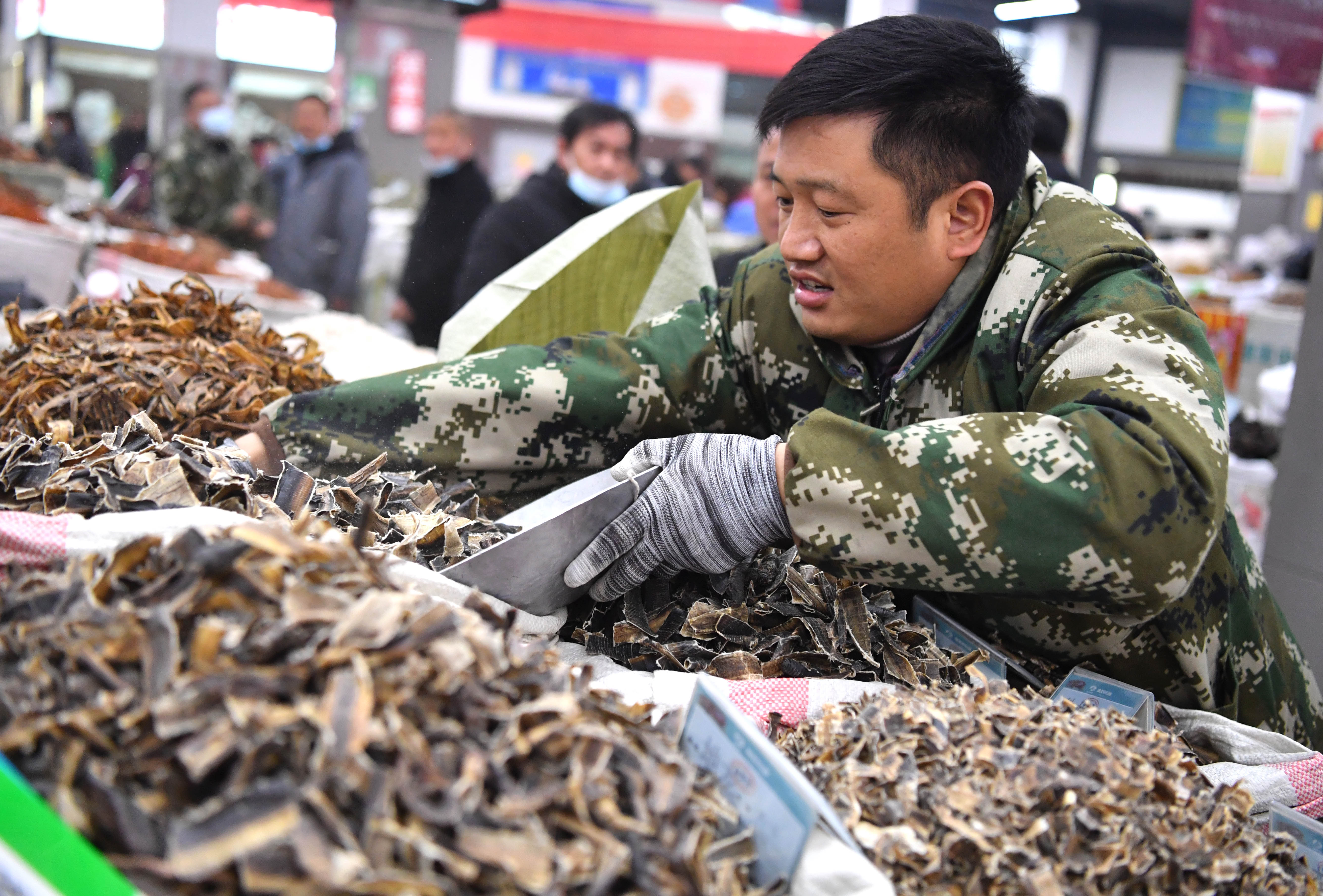 圖為3月1日,藥商在安徽省亳州中藥材專業(yè)市場內(nèi)選購藥材。(劉勤利 攝)