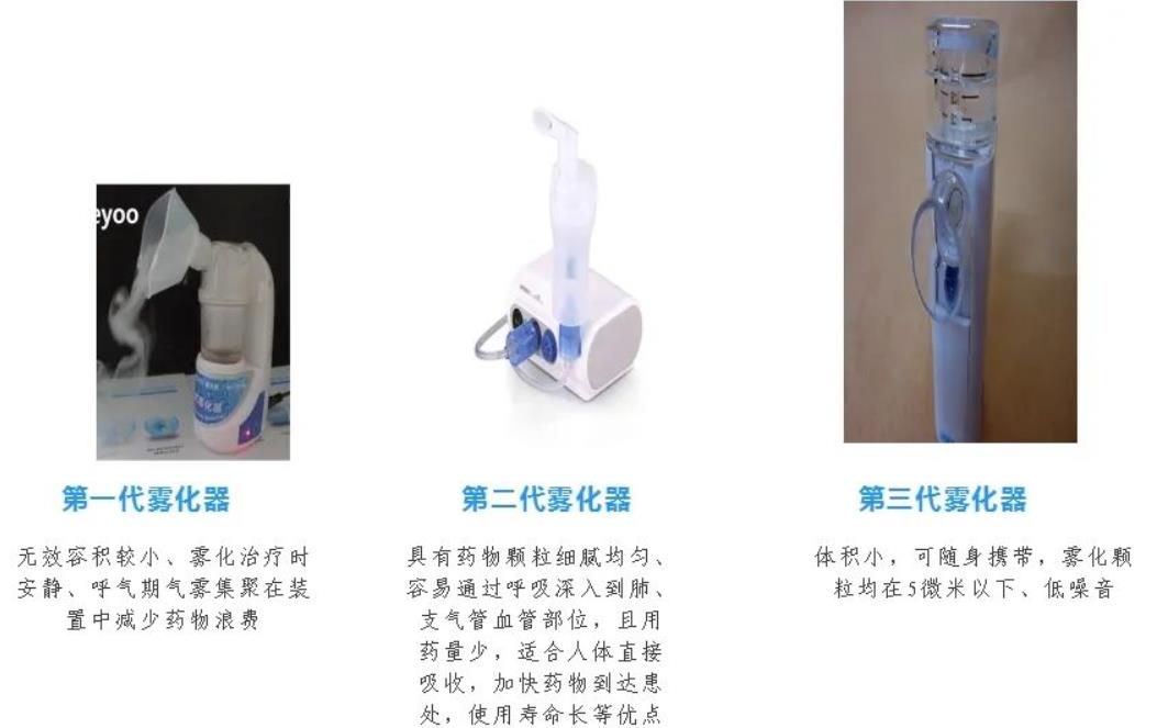 隨著技術的發(fā)展,目前用于哮喘治療的霧化器產(chǎn)品已從第一代升級到第三代,這三代產(chǎn)品呈現(xiàn)出霧化器三個不同的發(fā)展階段。在醫(yī)學上,超聲霧化器被稱為第一代霧化器,壓縮式霧化器為第二代霧化器,微網(wǎng)式霧化器為第三代霧化器。