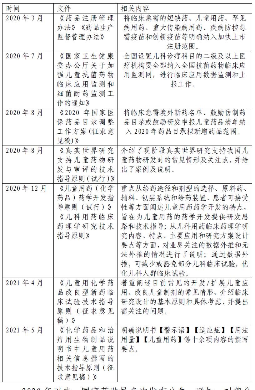 2020年以來,國家藥監(jiān)局多次發(fā)布公告、通知,對部分涉兒童藥品進(jìn)行注銷或要求修訂藥品說明書中涉及兒童的部分,其中涉及的藥品類型包括退熱、抗腫瘤、精神科藥品等,如表2所示。同時(shí),創(chuàng)新兒童藥品也被納入優(yōu)先審評。根據(jù)《中國醫(yī)藥報(bào)》刊登的《全力破解兒童用藥短缺難題》,數(shù)據(jù)顯示,截至目前,通過優(yōu)先審評通道獲批上市的兒童用藥累計(jì)達(dá)32個(gè),2021年至今已有12個(gè)兒童用藥獲批上市,完成數(shù)量及審評速度均有明顯提升。2021年5月31日,國家藥監(jiān)局藥品審評中心網(wǎng)站正式開通“兒童用藥專欄”。欄目匯集兒童用藥領(lǐng)域的政策法規(guī)、技術(shù)指南等信息,未來將成為企業(yè)、醫(yī)生、公眾了解國家兒童用藥政策法規(guī),把握研發(fā)技術(shù)要求,與藥監(jiān)部門互動溝通的重要窗口。