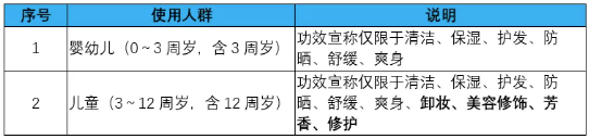 關(guān)于兒童化妝品的功效宣稱分類,《化妝品分類規(guī)則和分類目錄》附表3中進行了更為詳細(xì)的規(guī)定,并將兒童進一步細(xì)分成了嬰幼兒(0~3周歲,含3周歲)和兒童(3~12周歲,含12周歲)。具體區(qū)分見表:
