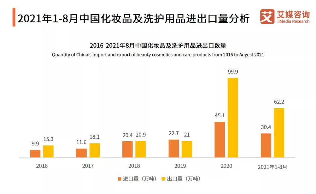 數(shù)據(jù)顯示,2021年1-8月中國(guó)化妝品及洗護(hù)用品進(jìn)口數(shù)量為30.4萬(wàn)噸,同比增長(zhǎng)5.8%;出口數(shù)量為62.2萬(wàn)噸,同比減少3.3%。艾媒咨詢(xún)分析師認(rèn)為,2020年及2021年化妝品及洗護(hù)用品出口量在2019年的基礎(chǔ)上大增的主要原因在于疫情之下中國(guó)洗護(hù)用品出口增多。隨著中國(guó)化妝品市場(chǎng)的監(jiān)管日益完善,中國(guó)化妝品產(chǎn)品的質(zhì)量進(jìn)一步得到保證,中國(guó)化妝品品牌的長(zhǎng)期國(guó)際競(jìng)爭(zhēng)力也有望提升。