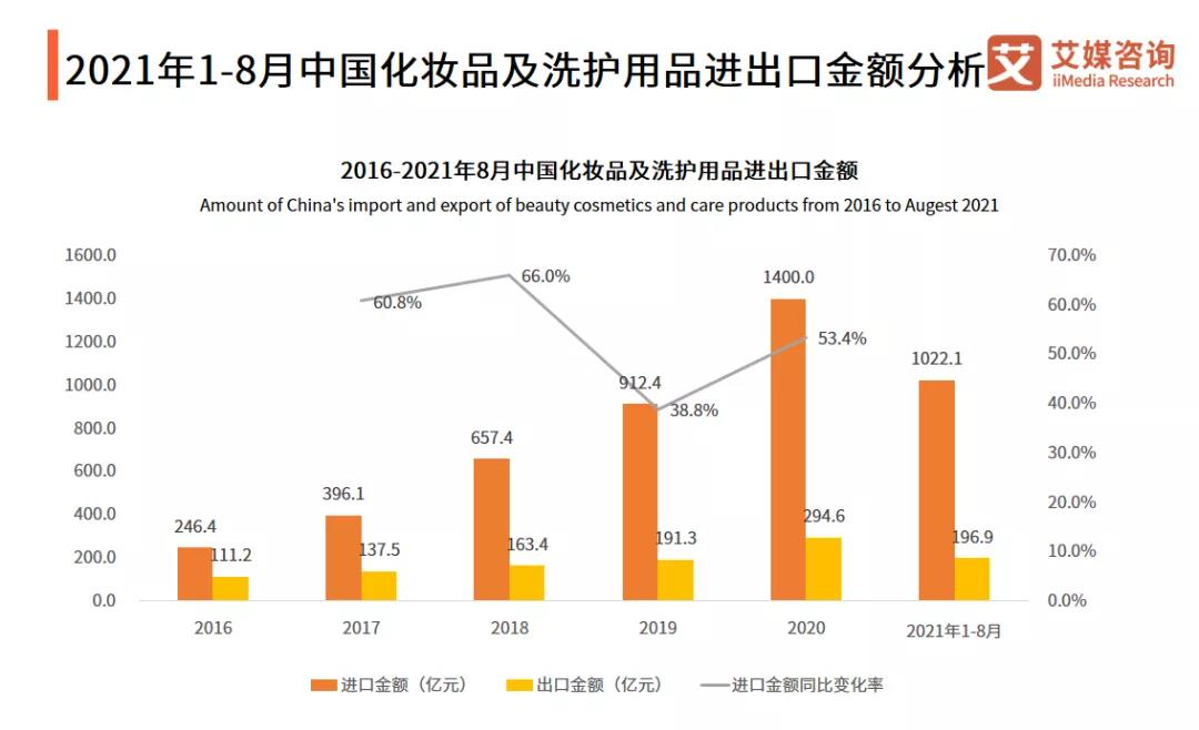 數(shù)據(jù)顯示,2021年1-8月,中國(guó)化妝品及洗護(hù)用品進(jìn)口金額為1022.1億元,同比增長(zhǎng)21.2%;出口金額為196.9億元,同比增長(zhǎng)1.6%。艾媒咨詢(xún)分析師認(rèn)為,中國(guó)化妝品及洗護(hù)用品進(jìn)口金額持續(xù)高增,反映中國(guó)消費(fèi)者對(duì)進(jìn)口化妝品及洗護(hù)用品的消費(fèi)能力的提升,化妝品電商可積極布局化妝品進(jìn)口市場(chǎng)。