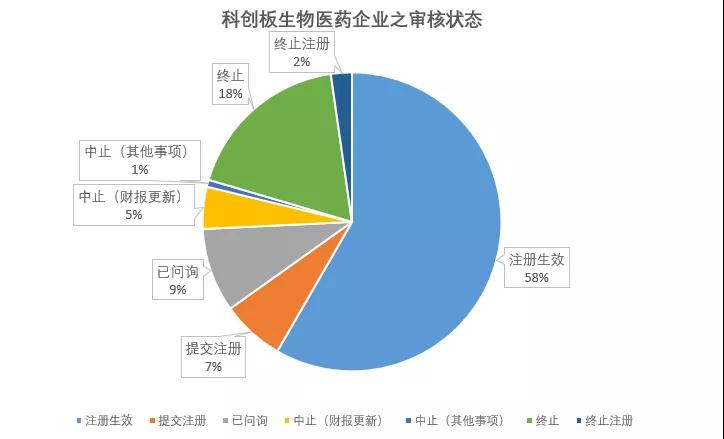 目前已申報(bào)科創(chuàng)板的132家生物醫(yī)藥企業(yè)中,共77家已通過證監(jiān)會(huì)注冊(cè),占已申報(bào)企業(yè)數(shù)量的58%;27家終止了上市審核,占已申報(bào)企業(yè)數(shù)量的20%。具體審核狀態(tài)如下圖所示: