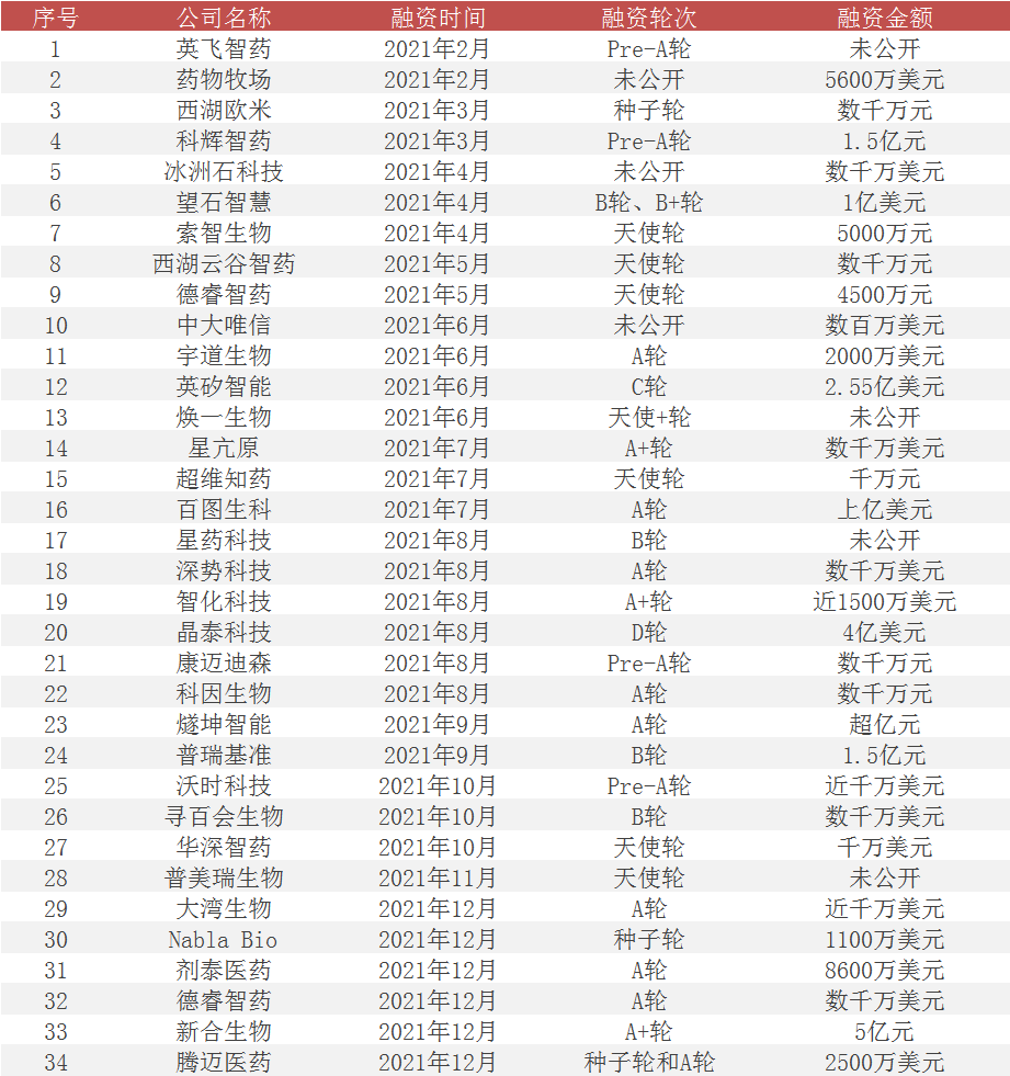 2021年國內(nèi)AI制藥領(lǐng)域融資情況一覽