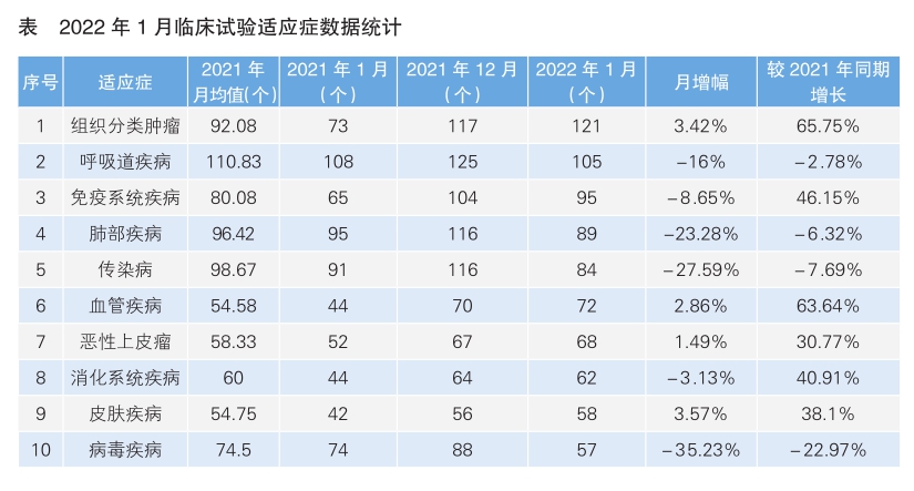 從1月份新增臨床試驗的熱門適應(yīng)癥情況來看,組織分類腫瘤仍為最熱門研發(fā)領(lǐng)域,試驗數(shù)量為121項,相較于2021年12月份上升3.42%。1月份主要熱門適應(yīng)癥的臨床試驗相較于2021年12月份大多呈現(xiàn)上升趨勢,下降明顯的熱門適應(yīng)癥為病毒類疾病。推測新冠肺炎疫情對于臨床試驗的影響正在顯著下降,臨床試驗正在逐步恢復(fù)常態(tài)。