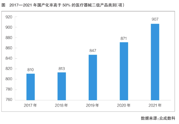 隨著扶持政策的出臺(tái)和創(chuàng)新技術(shù)的提升,我國醫(yī)療器械替代進(jìn)程加快,產(chǎn)品國產(chǎn)化率顯著提升。眾成數(shù)科數(shù)據(jù)顯示,2017—2021年,國產(chǎn)化率高于50%的二級產(chǎn)品類別(根據(jù)《醫(yī)療器械分類目錄》中的二級產(chǎn)品類別統(tǒng)計(jì),下同)逐年增長,已從2017年的810項(xiàng)增長至2021年的907項(xiàng),近5年進(jìn)口替代優(yōu)勢品類復(fù)合增長率為2.87%(詳見圖)。