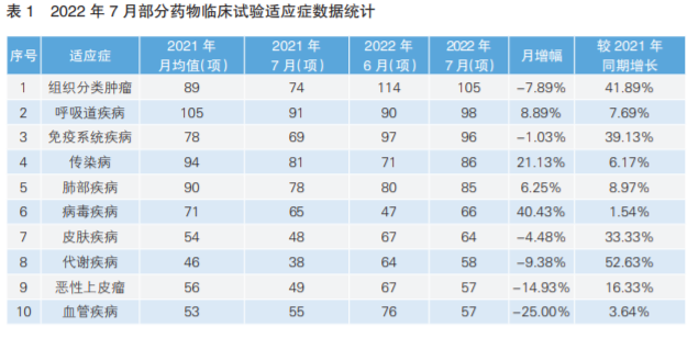 從適應(yīng)癥來看,組織分類腫瘤治療仍為7月份所有新開臨床試驗中最主要的熱門研發(fā)領(lǐng)域,新開相關(guān)臨床試驗數(shù)量105項,較6月份降低7.89%。各適應(yīng)癥領(lǐng)域新開臨床試驗數(shù)量相較上月大多呈下降趨勢,其中降幅最大的為血管疾病領(lǐng)域,降幅為25.00%。數(shù)量增長較為明顯的熱門適應(yīng)癥為病毒疾病和傳染病,同比增幅分別為40.43%和21.13%,呼吸道疾病和肺部疾病領(lǐng)域也略有增加(詳見表1)。