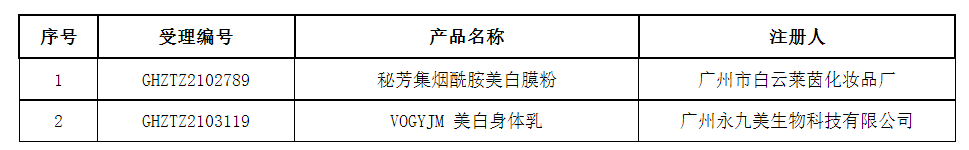 國(guó)家藥監(jiān)局網(wǎng)站發(fā)布1期化妝品不予批準(zhǔn)決定書待領(lǐng)取信息,共包括2個(gè)受理號(hào),涉及廣州市白云萊茵化妝品廠等企業(yè)(截至8月31日)(詳見表)。