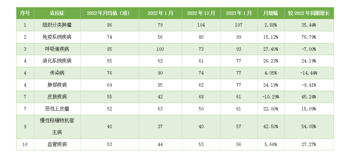 從1月份新增臨床試驗(yàn)熱門(mén)適應(yīng)癥領(lǐng)域來(lái)看,組織分類(lèi)腫瘤仍為最主要的熱門(mén)研發(fā)領(lǐng)域, 試驗(yàn)數(shù)量為107項(xiàng),相較12月份上升 2.88%;其次為免疫系統(tǒng)疾病,但數(shù)量相較于上月上升15.12%。月增幅最高的熱門(mén)適應(yīng)癥為慢性移植物抗宿主病,單月增幅均超過(guò)40%。僅有皮膚類(lèi)疾病本月相較上月下降,下降幅度為10.29%。(詳見(jiàn)表1)