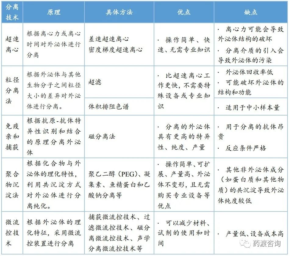目前,研究人員已根據(jù)外泌體的大小、密度、表面電荷以及其表面相關(guān)的蛋白質(zhì)開(kāi)發(fā)了多種外泌體分離方法,主要包括超速離心、超濾、體積排阻色譜、免疫親和捕獲、聚合物沉淀法和微流控技術(shù)(各技術(shù)原理及優(yōu)缺點(diǎn)見(jiàn)下表)。