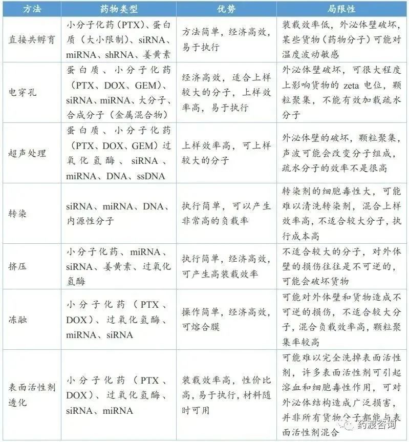 外源性裝載是通過(guò)電穿孔或脂質(zhì)體轉(zhuǎn)染等方法將目的藥物導(dǎo)入分離后的外泌體中。目前,外源性裝載可裝載小分子化藥、蛋白質(zhì)、多肽、核酸藥物、天然產(chǎn)物等,裝載藥物方式主要包括直接共孵育、電穿孔、超聲處理、轉(zhuǎn)染、擠壓、凍融、表面活性劑透化(詳見(jiàn)下表)。