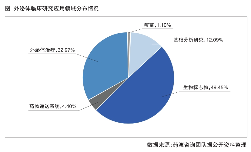 182項(xiàng)外泌體領(lǐng)域的臨床研究中,有90項(xiàng)(49.45%)是關(guān)于生物標(biāo)志物的應(yīng)用,59項(xiàng)(32.97%)為外泌體治療藥物研究,8項(xiàng)(4.40%)關(guān)于藥物遞送系統(tǒng),22項(xiàng)(12.09%)屬于外泌體基礎(chǔ)分析研究;此外,疫苗類(lèi)臨床研究有3項(xiàng)(1.10%)(詳見(jiàn)圖)。