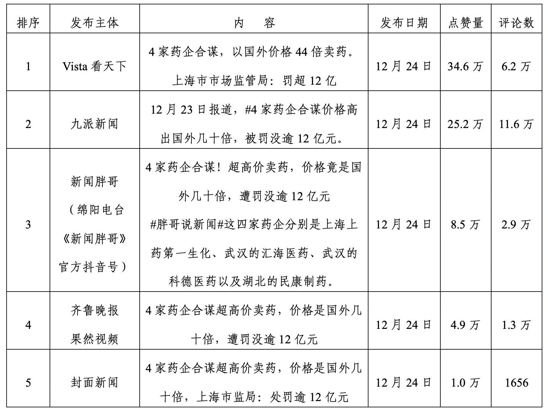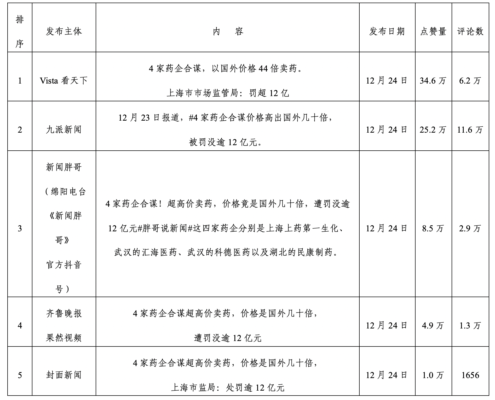 第二階段:上海市市場監(jiān)管局發(fā)布行政處罰決定書,四家藥企被罰12億,輿情再次升高后逐漸走低