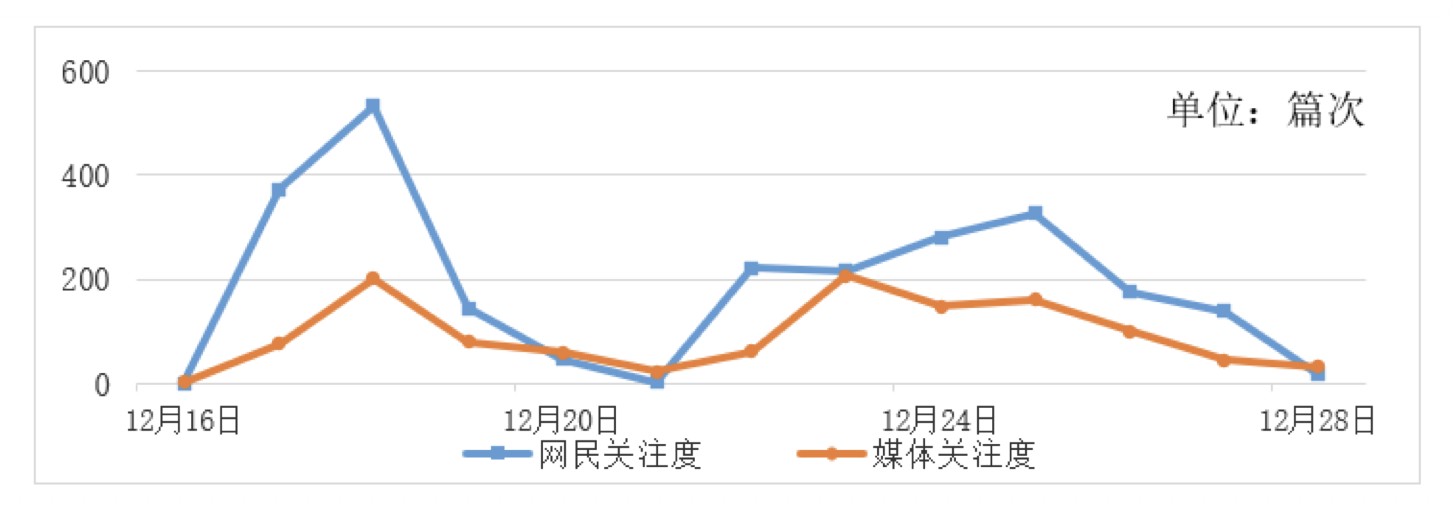 以2023年12月16日-12月28日為監(jiān)測時間段,如圖1所示,輿情走勢呈“波浪式”發(fā)展,網(wǎng)民關(guān)注度高于媒體關(guān)注度。12月17日,受上海醫(yī)藥發(fā)布全資子公司被罰公告的影響,輿情熱度迅速攀升,于12月18日到達(dá)監(jiān)測期內(nèi)最高峰。12月22日,上海市市場監(jiān)管局在其官方微信號上發(fā)布《行政處罰決定書》相關(guān)內(nèi)容受到媒體廣泛關(guān)注,輿情出現(xiàn)波動,并于12月24日達(dá)到監(jiān)測期內(nèi)次高峰,隨后逐漸回落至平穩(wěn)。