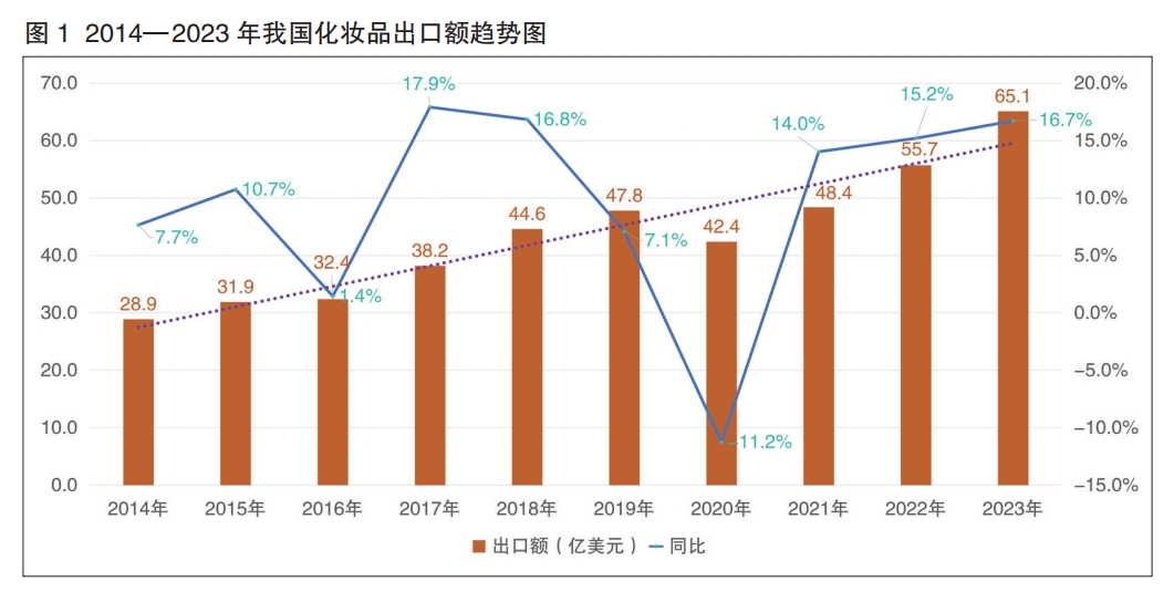 近十年來,我國化妝品出口額基本保持增長態(tài)勢,從2014年的28.9億美元逐步攀升至2023年的65.1億美元;除2020年因受新冠疫情影響出口額有所下滑外,其余年份均保持正增長,且增幅大部分超過10個百分點(詳見圖1),充分體現(xiàn)出我國化妝品國際競爭力正穩(wěn)步提升。