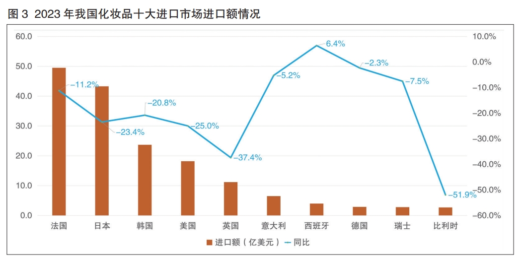 我國化妝品進口前十大市場中,只有排名第七位的西班牙保持正增長,增幅為6.4%,其余均為負增長。
