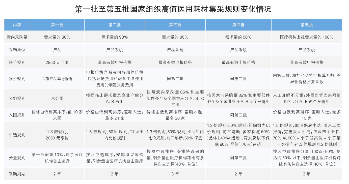 2018年以來,我國醫(yī)用耗材集中帶量采購經(jīng)歷了從局部試點到全國推廣、從單一品類到全領(lǐng)域覆蓋的深刻變革。目前,已基本形成?“11233”的政策框架體系,即建設(shè)全國統(tǒng)一醫(yī)保信息系統(tǒng),實現(xiàn)醫(yī)療器械“一品一碼”,搭建國家和省級兩級平臺,建立國家、省、市三級采購體系,采用集中帶量采購、掛網(wǎng)采購、醫(yī)院備案采購三種采購方式。與此同時,集采規(guī)則也在逐步完善。以國家組織高值醫(yī)用耗材集采為例,從第一批至第五批,始終堅持以現(xiàn)存問題為導(dǎo)向,不斷完善規(guī)則,實現(xiàn)靶向發(fā)力。