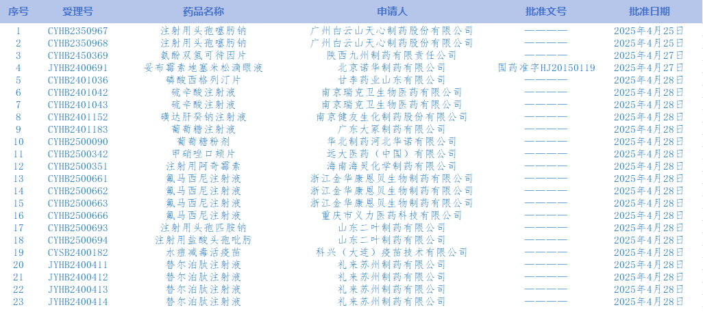1.國(guó)家藥監(jiān)局發(fā)布2期藥品批準(zhǔn)證明文件送達(dá)信息,共包括23個(gè)受理號(hào),涉及廣州白云山天心制藥股份有限公司等企業(yè)。