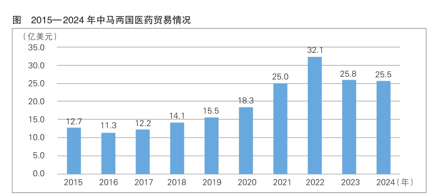 據中國海關統計數據,中馬兩國醫(yī)藥貿易額由2015年的12.7億美元,增長至2024年的25.5億美元(詳見圖),10年間復合增長率為7.22%,總體保持增長態(tài)勢。