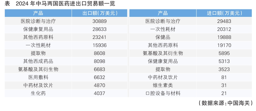 中馬兩國在疫苗、醫(yī)院診斷與治療、保健康復等醫(yī)藥產品中的合作進一步深化。2024年,醫(yī)院診斷與治療產品貿易額較高,約為6.04億美元,其他西藥原料、一次性耗材等產品貿易額均超過1億美元(詳見表)。