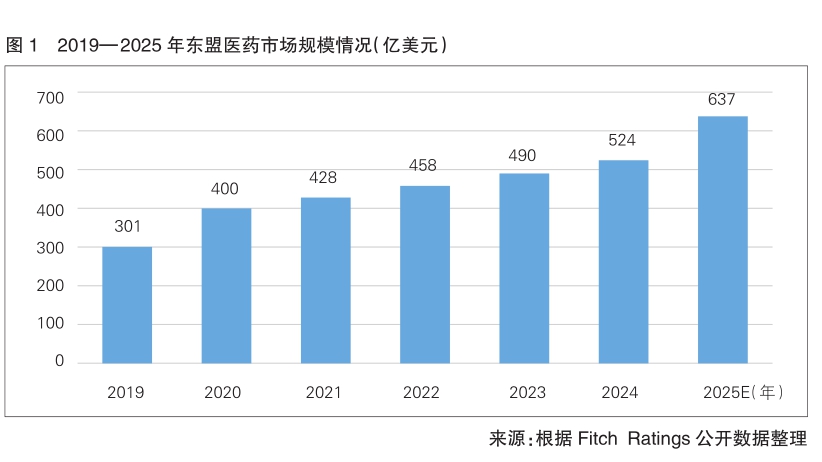 根據(jù)Fitch Ratings公開數(shù)據(jù),東盟醫(yī)藥市場規(guī)模已由2019年的約301億美元增至2024年的約524億美元,預(yù)計2025年突破600億美元大關(guān),增至637億美元(詳見圖1)。根據(jù)Statista統(tǒng)計數(shù)據(jù),2024年東盟處方藥市場規(guī)模約為13.42億美元,預(yù)計2029年將增至16.05億美元,年復(fù)合增長率3.64%。