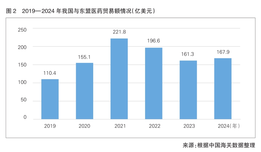 根據(jù)中國海關(guān)數(shù)據(jù),我國與東盟的雙邊醫(yī)藥貿(mào)易額由2019年的110.4億美元增至2024年的167.9億美元,年均復(fù)合增長率約為7.2%(詳見圖2)。今年一季度,我國與東盟的雙邊醫(yī)藥貿(mào)易額為41.3億美元,同比增長1.6%,占一季度我國醫(yī)藥外貿(mào)總額的8.8%,繼續(xù)保持增長勢頭。