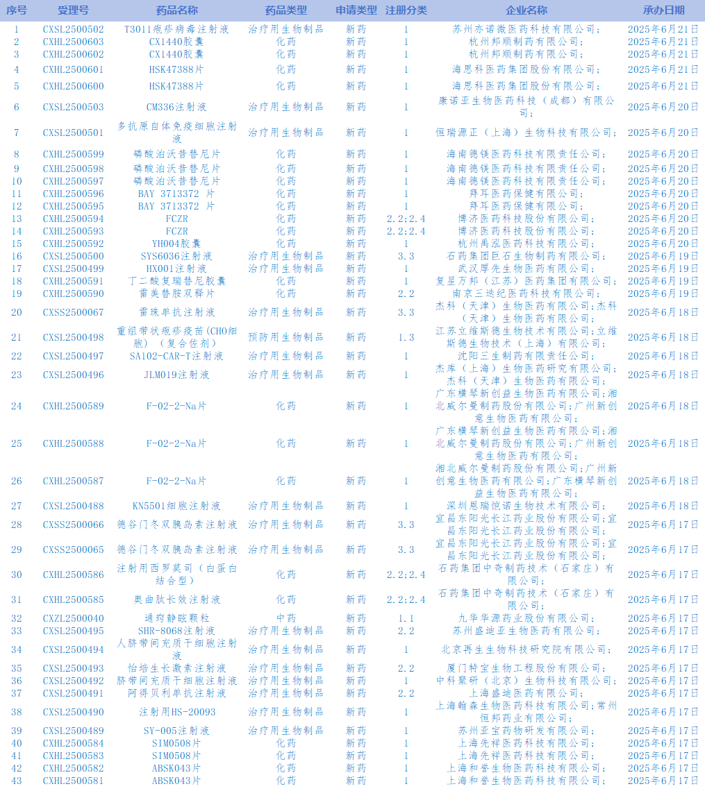 2. CDE承辦受理43個新藥上市申請,包括T3011皰疹病毒注射液等。