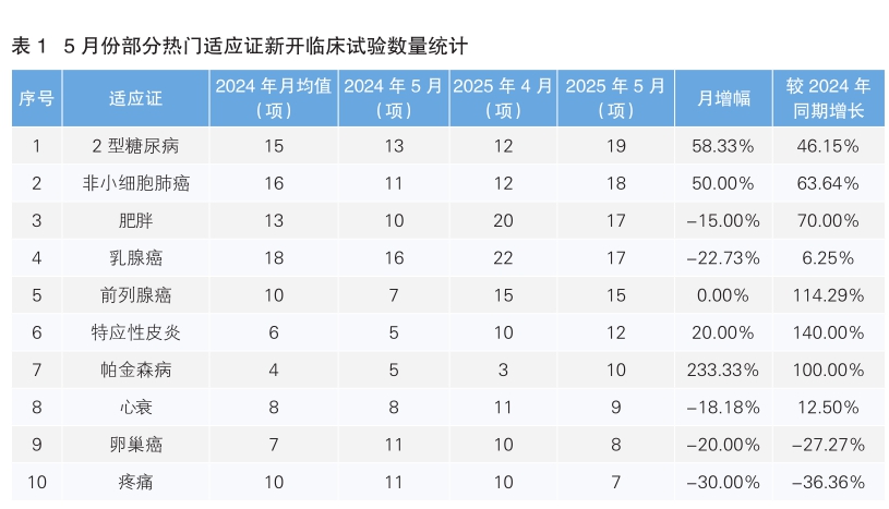 從5月份新開臨床試驗熱門適應(yīng)證來看,2型糖尿病為最主要的熱門研發(fā)領(lǐng)域,新開試驗19項,相較4月份上漲58.33%,相較去年同期上漲46.15%。其次為非小細(xì)胞肺癌,新開臨床試驗數(shù)量環(huán)比上漲50%,同比上漲63.64%。值得注意的是,5月份新開臨床試驗數(shù)量上升幅度最大的熱門適應(yīng)證為帕金森病,由4月份的3項上升為10項,上升幅度為233.33%。除此之外,相較于去年同期,新開臨床試驗數(shù)量上漲幅度最大的適應(yīng)證為特應(yīng)性皮炎,由5項上升為12項,上漲幅度為140%;數(shù)量下降幅度最大的適應(yīng)證為疼痛,由11項下降為7項,下降36.36%。(詳見表1)