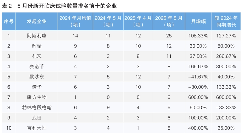 對新開臨床試驗的發(fā)起企業(yè)進(jìn)行統(tǒng)計后發(fā)現(xiàn),5月份發(fā)起臨床試驗最多的企業(yè)為阿斯利康,新開臨床試驗25項,環(huán)比上升108.33%,同比上升127.27%;其次為輝瑞,新開臨床試驗12項,環(huán)比上漲20%,同比增長50%。新開臨床試驗數(shù)量上升幅度最大的企業(yè)為康方生物,與其4月份相比上升了6倍。值得注意的是,這也是我國企業(yè)康方生物首次進(jìn)入新開臨床試驗數(shù)量排名前十榜單。(詳見表2)