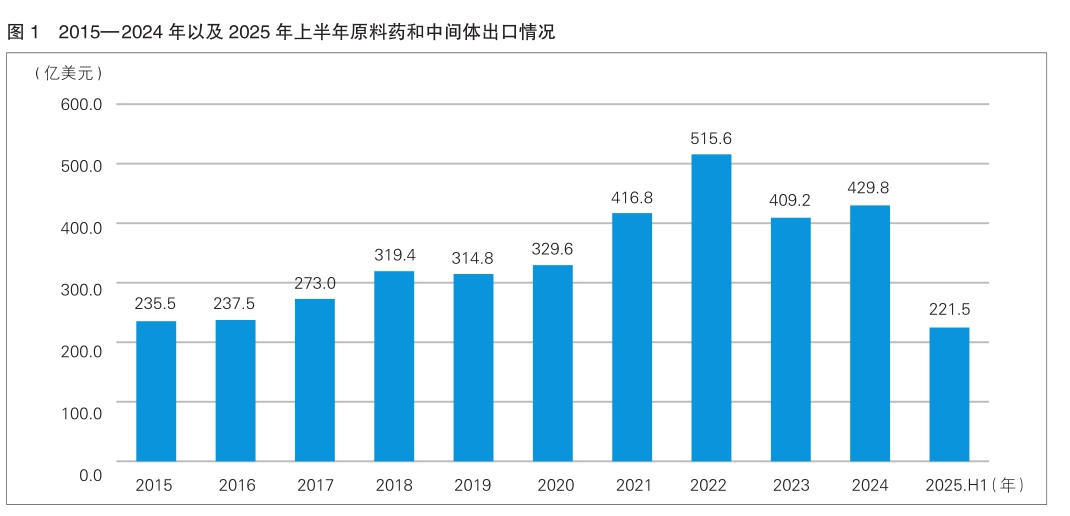 原料藥和中間體出口“以價(jià)換量”現(xiàn)象得到緩解。2015—2024年,我國(guó)原料藥和中間體出口額從235.5億美元增長(zhǎng)至429.8億美元,年復(fù)合增長(zhǎng)率達(dá)7.7%,彰顯了我國(guó)作為全球原料藥和中間體供應(yīng)大國(guó)的持續(xù)穩(wěn)固地位(詳見圖1)。