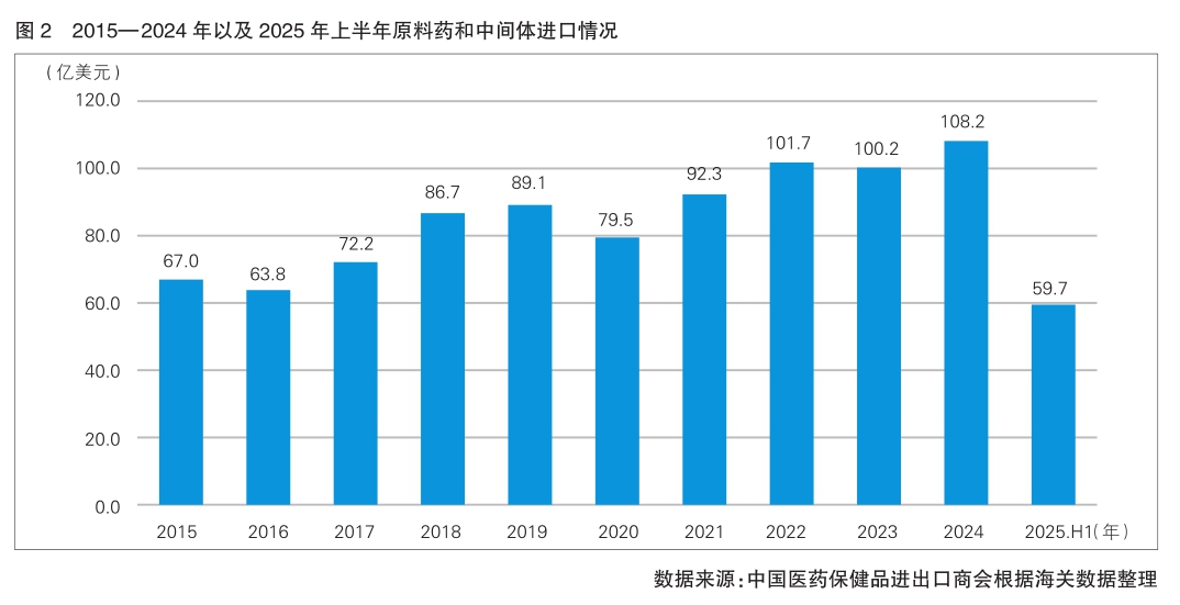 2015—2024年,我國(guó)原料藥和中間體進(jìn)口額從67.0億美元增至108.2億美元,年復(fù)合增長(zhǎng)率為5.9%,略低于同期出口復(fù)合增長(zhǎng)率(詳見圖2)。