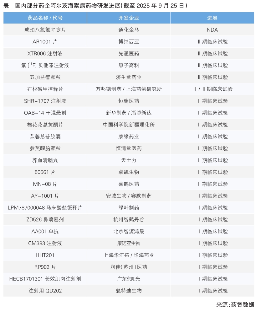 國內(nèi)企業(yè)近年來也在AD治療領(lǐng)域加速發(fā)力,多個項目推進至關(guān)鍵階段:通化金馬的琥珀八氫氨吖啶片已提交新藥上市申請(NDA),是國內(nèi)進展最快的項目之一;博納西亞的AR1001、先通醫(yī)藥的XTR006注射液、原子高科的氟[18F]貝他嗪注射液等已進入Ⅲ期臨床試驗。從劑型來看,國內(nèi)研發(fā)以口服制劑為主,亦涵蓋注射液類產(chǎn)品(詳見表)。