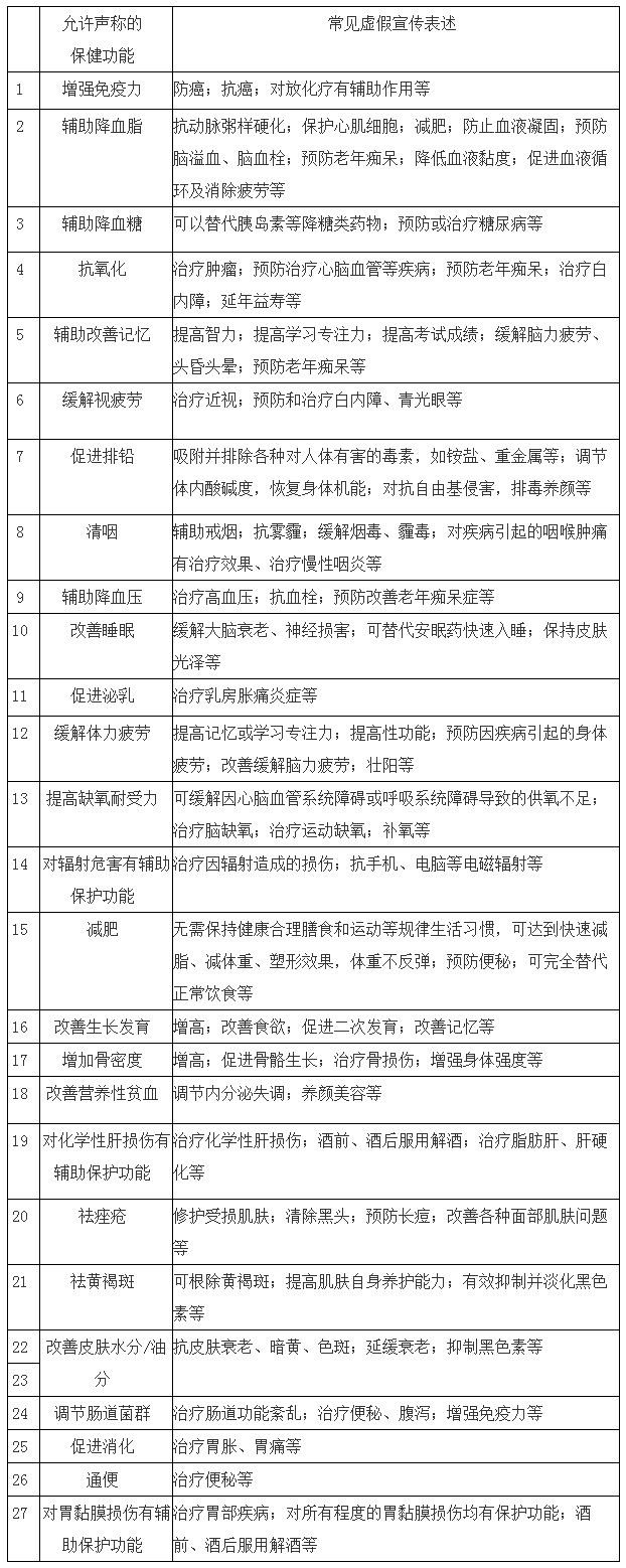 保健食品生產(chǎn)經(jīng)營者應(yīng)嚴(yán)格按照注冊(cè)或備案的保健功能進(jìn)行標(biāo)簽標(biāo)識(shí)和宣傳表述。我們整理了市場(chǎng)上針對(duì)監(jiān)管部門批準(zhǔn)的27類保健功能的虛假宣傳表述(詳見附表)。凡有這些虛假宣傳表述的產(chǎn)品,無論是在商超等線下實(shí)體店銷售,還是通過網(wǎng)絡(luò)、會(huì)議、電視、廣播、電話和報(bào)刊等方式銷售,請(qǐng)消費(fèi)者都不要購買,同時(shí)可以撥打熱線電話12331、12315進(jìn)行投訴舉報(bào)。