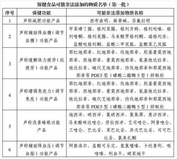 根據(jù)國(guó)家食品藥品監(jiān)督管理局《保健食品中可能非法添加的物質(zhì)名單(第一批)》(食藥監(jiān)辦?;?012〕33號(hào)),保健食品可能非法添加的物質(zhì)名單如下: