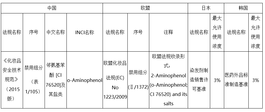 為保障化妝品使用安全,參考國(guó)際化妝品相關(guān)法規(guī),在《化妝品安全技術(shù)規(guī)范》(2015年版)修訂過程中,鄰氨基苯酚歸為禁用組分。