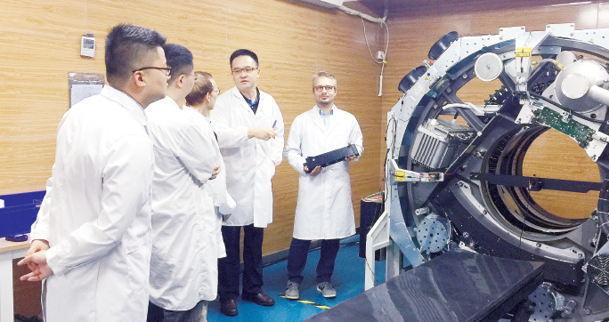 圖為華中科技大學(xué)生命學(xué)院科研人員在探討創(chuàng)新醫(yī)療器械"全數(shù)字正電子發(fā)射及X線斷層成像掃描系統(tǒng)"。楊亞攝