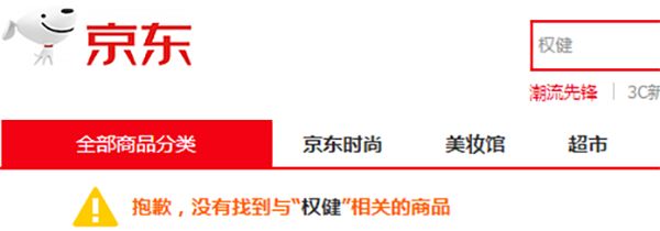 京東頁面顯示:抱歉,沒有找到與“權(quán)健”相關(guān)的商品;