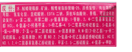 在化妝品抽檢過程中,發(fā)現(xiàn)部分染發(fā)類產(chǎn)品沒有按照法規(guī)及國標的要求清晰明確地標注染發(fā)劑成分,因而被判定為不合格。據(jù)統(tǒng)計,標簽標識成分指向不明主要有三種情況,分別是: