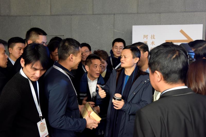 朱明春介紹碭山縣政府與阿里巴巴合作開展的魔豆媽媽扶貧產(chǎn)品,吸引了馬云駐足了解。