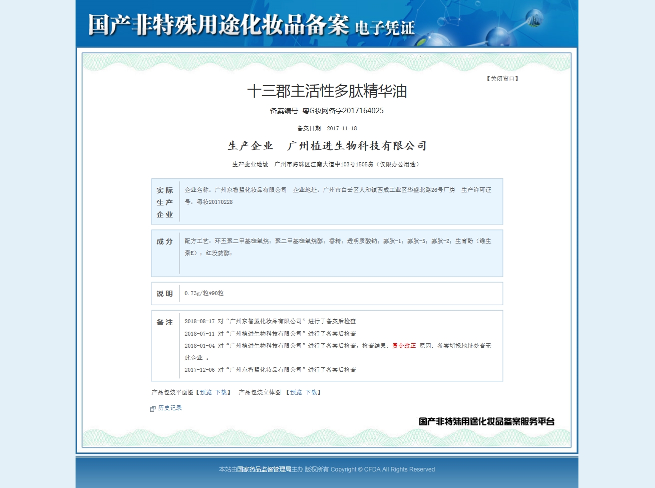 更有甚者,有些化妝品打著“EGF”的旗號(hào)宣傳,實(shí)際成分里卻沒有它。比如,五皇冠淘寶店鋪“13郡主”銷量最高的一款EGF精華液油膠囊,產(chǎn)品成分顯示主要從羊奶和一些動(dòng)物蛋白質(zhì)中提取有效成分,并且特別標(biāo)注該產(chǎn)品已通過藥品監(jiān)管部門備案。記者在國家藥監(jiān)局官網(wǎng)查詢國產(chǎn)非特殊用途化妝品備案信息發(fā)現(xiàn),該產(chǎn)品名稱為十三郡主活性多肽精華油,在其成分表中見不到EGF,只是含有寡肽-1、寡肽-2等成分。像這種化妝品商給寡肽-1產(chǎn)品貼上“EGF”標(biāo)簽來宣稱功效的現(xiàn)象在淘寶上頗為常見。(部分天貓?jiān)谑圻`法宣傳產(chǎn)品匯總見文末附圖)
