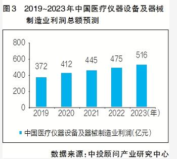 2016年,我國(guó)醫(yī)療儀器設(shè)備及器械制造業(yè)利潤(rùn)總額達(dá)到318.49億元,同比增長(zhǎng)32.29%;2017年1~9月,我國(guó)醫(yī)療儀器設(shè)備及器械制造業(yè)利潤(rùn)總額達(dá)到224.87億元,同比增長(zhǎng)7.4%。預(yù)計(jì)2019年我國(guó)醫(yī)療儀器設(shè)備及器械制造業(yè)利潤(rùn)將達(dá)到372億元,未來(lái)5年的年均復(fù)合增長(zhǎng)率約為8.52%,2023年我國(guó)醫(yī)療儀器設(shè)備及器械制造業(yè)利潤(rùn)將達(dá)到516億元。
