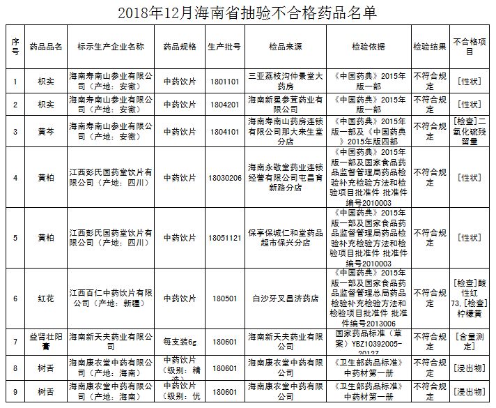 據(jù)了解,不合格藥品9批次中,3批次來(lái)自海南壽南山參業(yè)有限公司,2批次來(lái)自江西彭氏國(guó)藥堂飲片有限公司,2批次來(lái)自海南康農(nóng)堂中藥有限公司,江西百仁中藥飲片有限公司、海南新天夫藥業(yè)有限公司各占1批次。具體情況為: